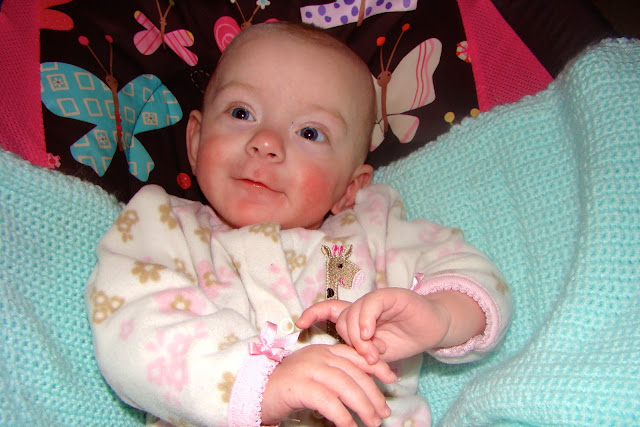 Also at my Dr. appointment I got GREAT news!!! I can now move to regular formula!! No more extra calories for me!! I still need my iron drops twice a day but that is it!! I am FINALLY starting to feel like a little normal little baby!! :) I was also weighed and I now weigh 13 pounds 13 ounces!!! That's over 11 pounds I grew since birth!!! I also grew a whole inch in length since the last month I was measured! So now I am 25 1/4" long! My head grew too, it is now at 40cm. So I guess all the extra calories from my formula was paying off, and I am really starting to finally fill out!! :) Oh and that is not the only thing growing, my hair is REALLY coming back now, so pretty soon I should have all my beautiful locks back :) The Dr. also did a smile test with me. He took a book with a bunch of babies smiling to see how I would react when I look at them, and guess what, I smiled right back at the pictures!! This I heard is something that normal 6 month old babies do, and look at me I am only "actually" 3 months and already wowing Dr's with my intelligence! I am becoming such a smart little princess :) That was about it for the news at the Doctor's. Sometime next week I will have to go back and get one more shot :( Oye I am not looking forward to that, but as always I will be fine :)